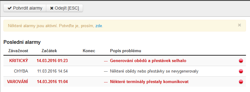 Alarmy jsou rozděleny dle závažnosti na čtyři kategorie – INFO, VAROVÁNÍ, CHYBA a KRITICKÝ. U alarmů závažnosti CHYBA a KRITICKÝ se uživatelům s rolí ředitel a administrátor zobrazuje hlášení, upozorňující na alarm.